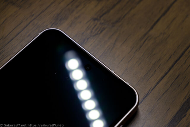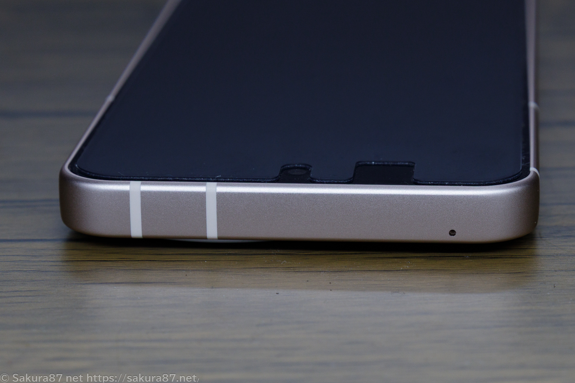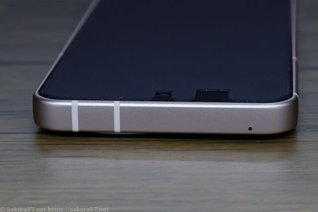 これも液晶保護シートを貼り付けた状態で、液晶保護シートの保護されてない部分に明るさセンサーや接近センサーが内蔵されています。