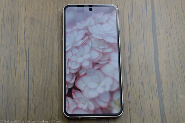 画面上部のパンチホールはカメラが1つのみ。あと写ってなさそうですがうっすらと細いラインで受話用スピーカーが内蔵されています。