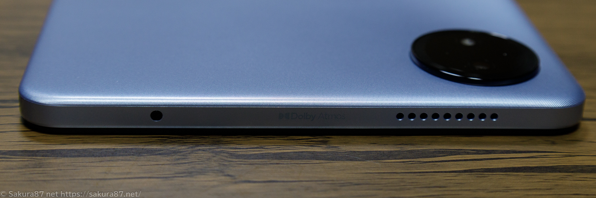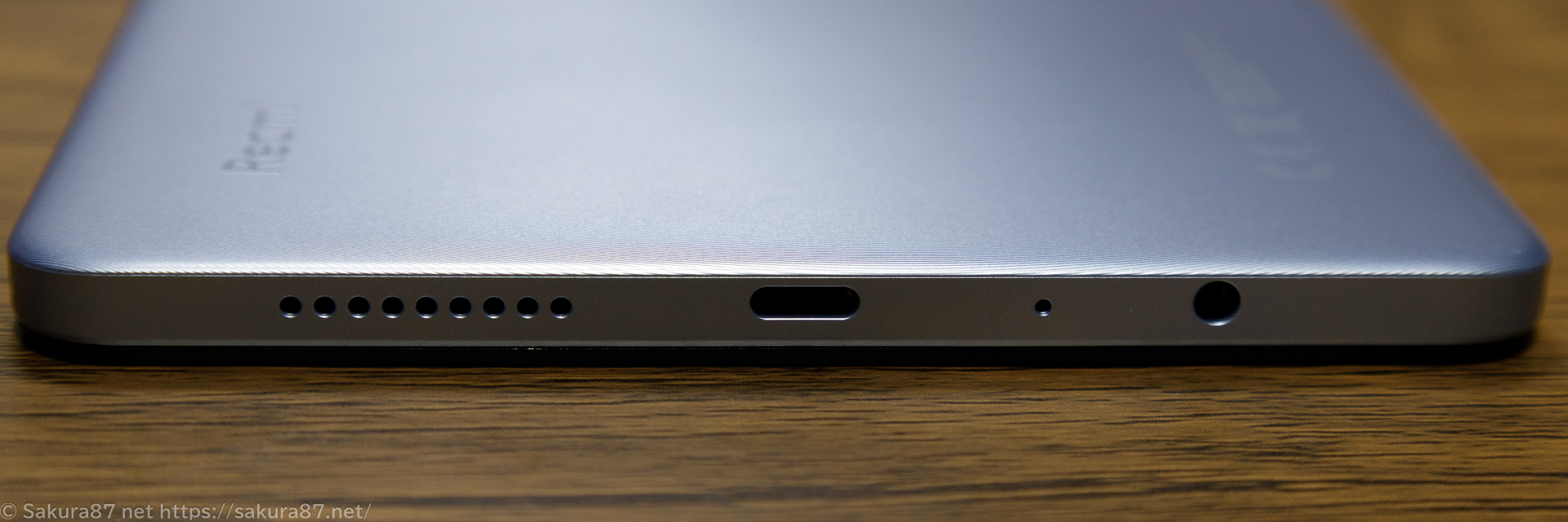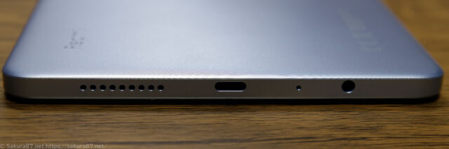 下側には写真左から(持った状態で右)スピーカー穴、USB-C、マイク穴(多分)、イヤホンジャックがあります。